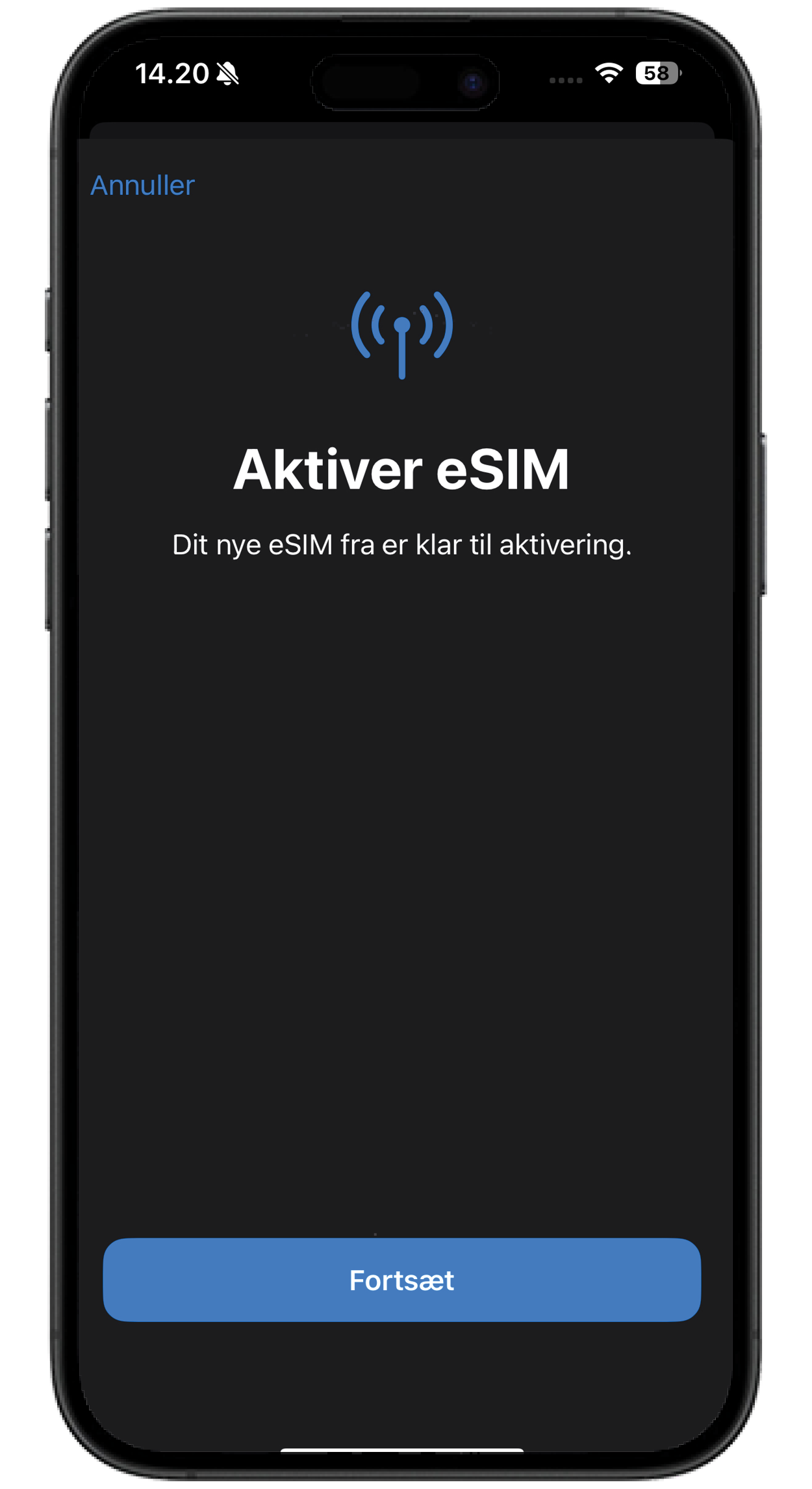Du modtager dit eSIM på en e-mail, hvor der er en QR-kode som du skal scanne og installere. Det tager kun 5 min. at installere eSIM'et og kræver blot, at du er på et Wi-Fi netværk. Husk at tage dit gamle fysiske simkort ud af telefonen inden du installere dit eSIM.